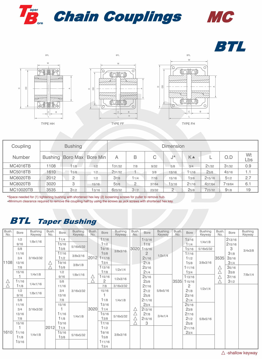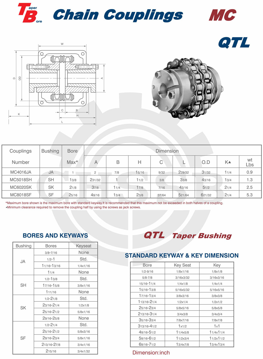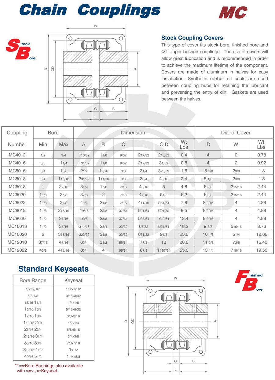 產品范圍: 美標:(SB-KC/FB-KC/FB-MC/BTL-MC/QTL-MC/FB-BC/STL-BC) 歐標:(KC) 英制尺寸產品(適用于美標市場) 公制尺寸產品(適用于歐標市場) KC鏈條聯軸器